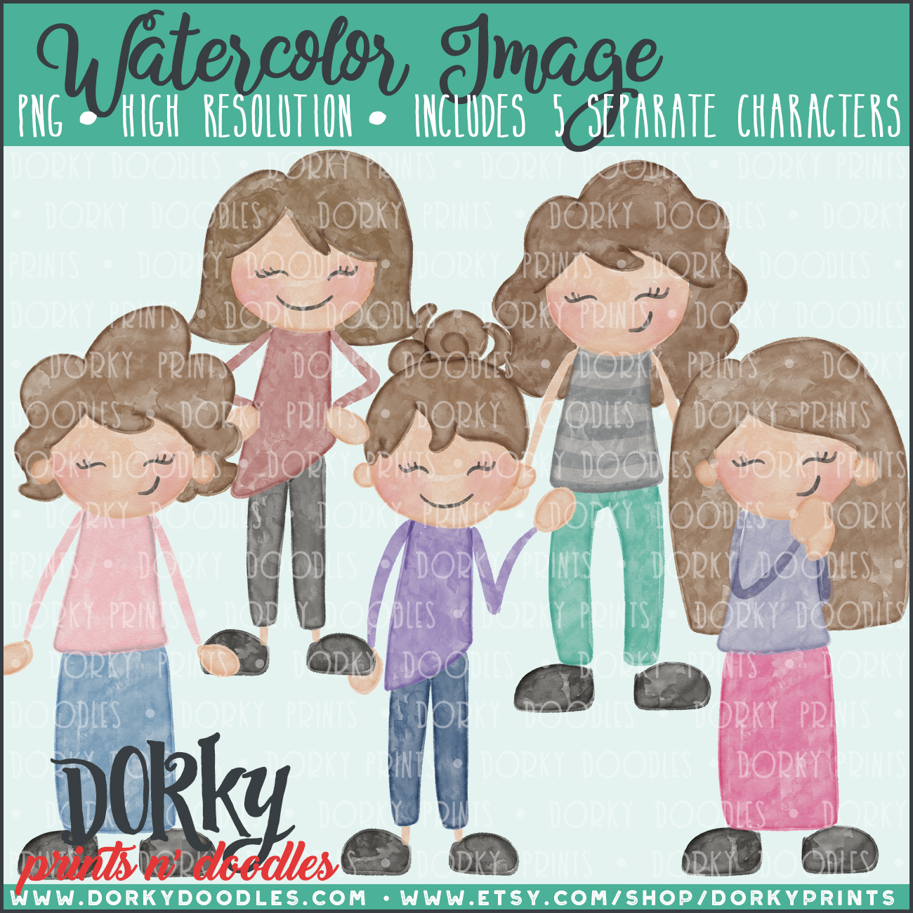 Family Characters Watercolor Printable Art – Brown Hair Women
